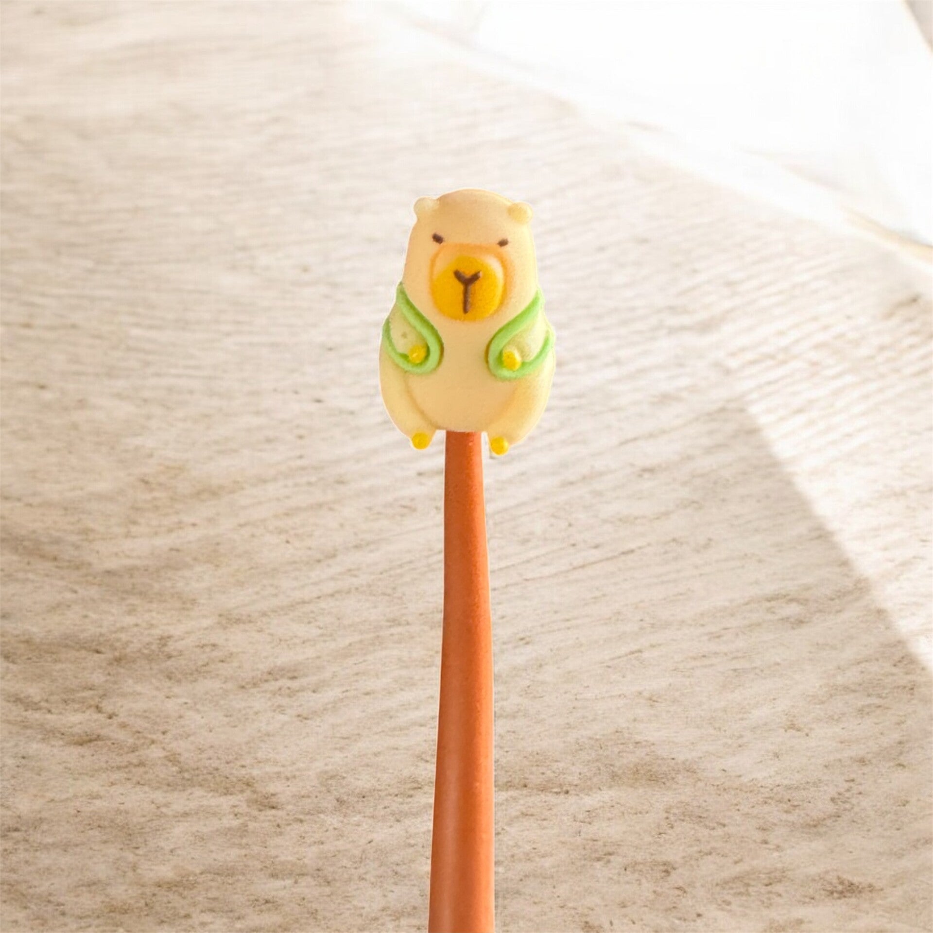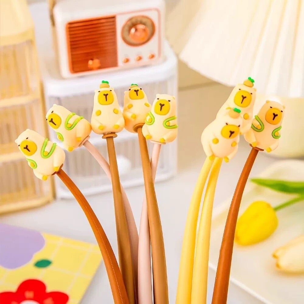 A silicone-bodied pen, black in color, cute and writes smoothly.